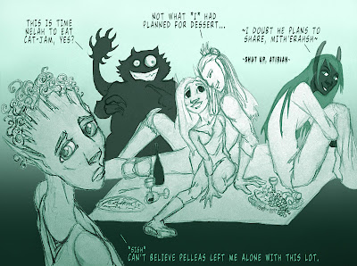 I wanted to do something a bit more... profound. Life, however, does what life will do, and this is not always as we shall have it. Therefore, rather than the grand picture I originally had planned, my silly little sketch (which I tried to clean and dress up a bit, at least, for the occasion) will have to suffice. Bear in mind, I doodled it last night while waiting for my insomnia medication to kick in... and I was watching anime so... take that as you will. (Hah!) Bit of inside, tongue-in-cheek joking about, but I sent our beloved little group on a picnic. Originally planned for Pelleas to be in it too but, meds kicked in so... wah-wah-waaaah... It's fine though. Nelah had a witty-quip to make up for his absence. ◕‿↼